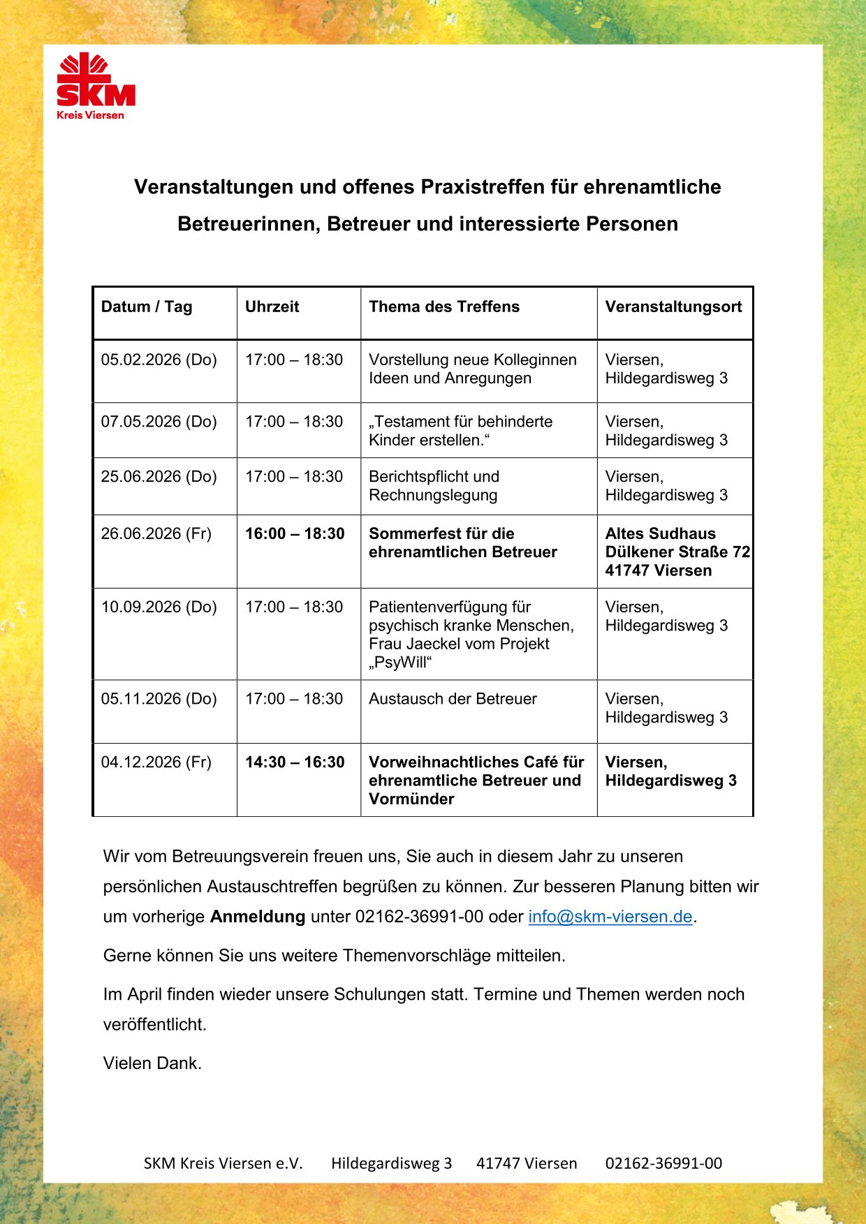 Offenes Praxistreffen für Betreuer*innen 2026 mit fachlicher Begleitung und Austausch und zusätzliche, öffentliche Veranstaltungen in Viersen